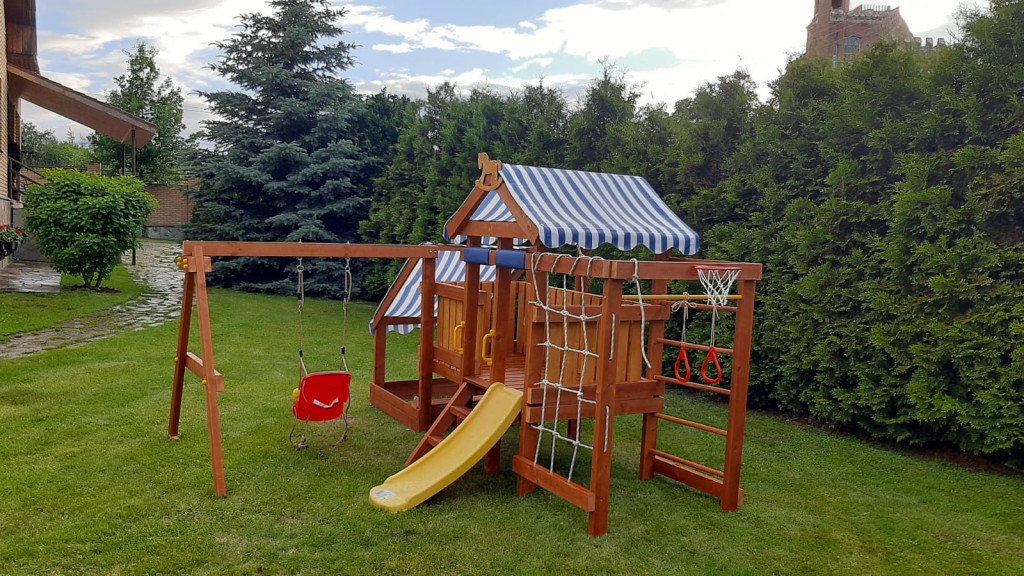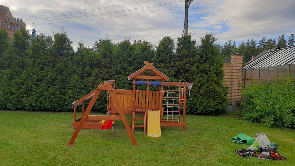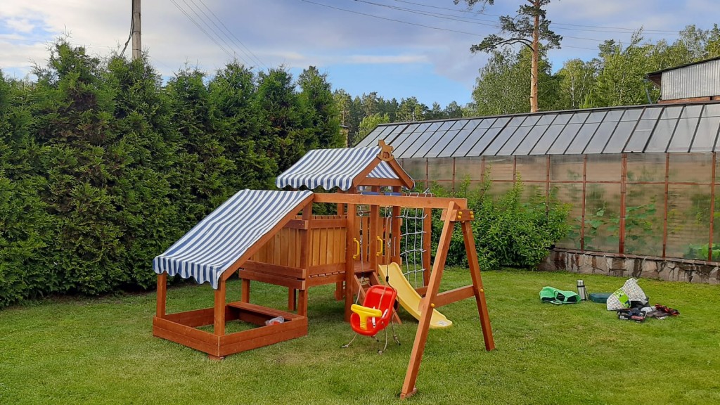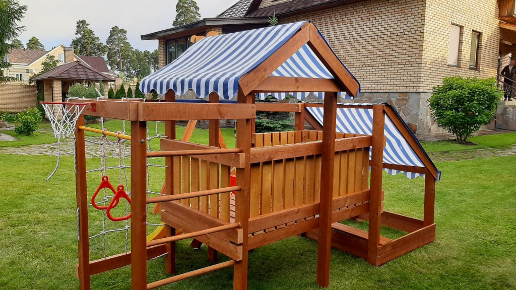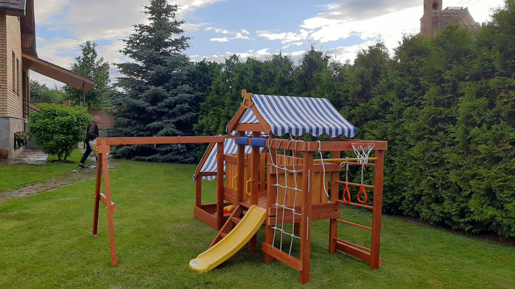 Клиенту для частного использования была необходима детская площадка. Выбор был сделан в пользу деревянной модели «Савушка Baby Play-12». Изделие выполнено из экологичных деревянных материалов, имеет разные спортивные и игровые элементы. Горку, песочницу, качели, баскетбольную корзину, гимнастические солнца. Полосатая крыша защищает играющих детей от солнечных лучей.