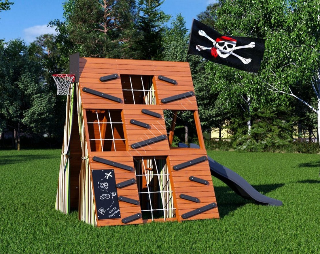 В домике есть всё, чтобы создать собственный мир игры и приключений: многосекционный скалодром с пластиковыми и деревянными зацепами, гладиаторские разноуровневые сетки, меловая доска для рисования и творчества, бинокль и даже баскетбольное кольцо со щитом. Внутренний лаз с выходом на платформу и внутренняя лестница - это ещё больше возможностей для детского творчества и активного отдыха.