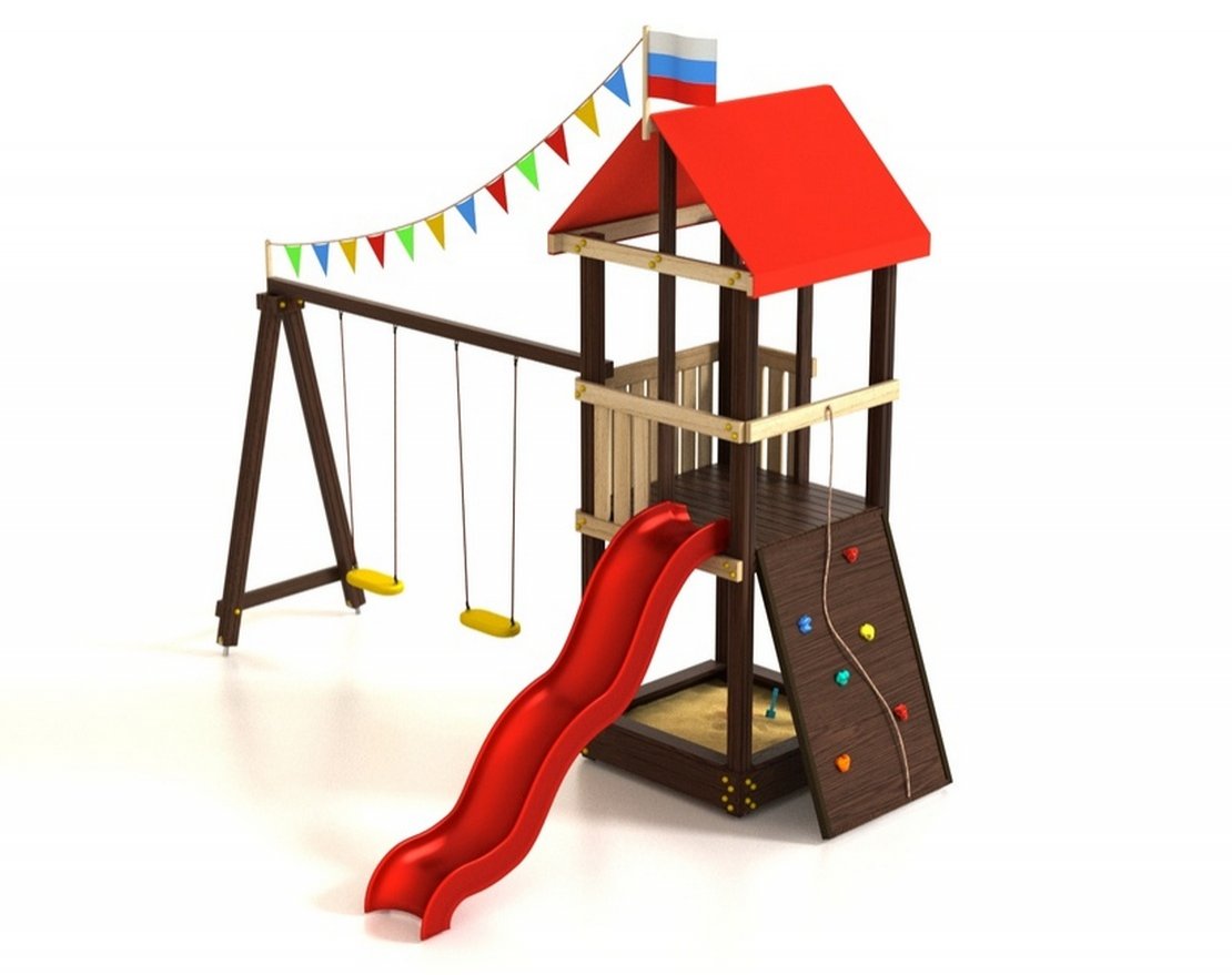 Изделие покрыто безопасной для детей высокоустойчивой краской на водной основе, которая надежно защищает древесину от воздействия окружающей среды. Перила, скалодром и лестница производятся по системе "шип паз".
