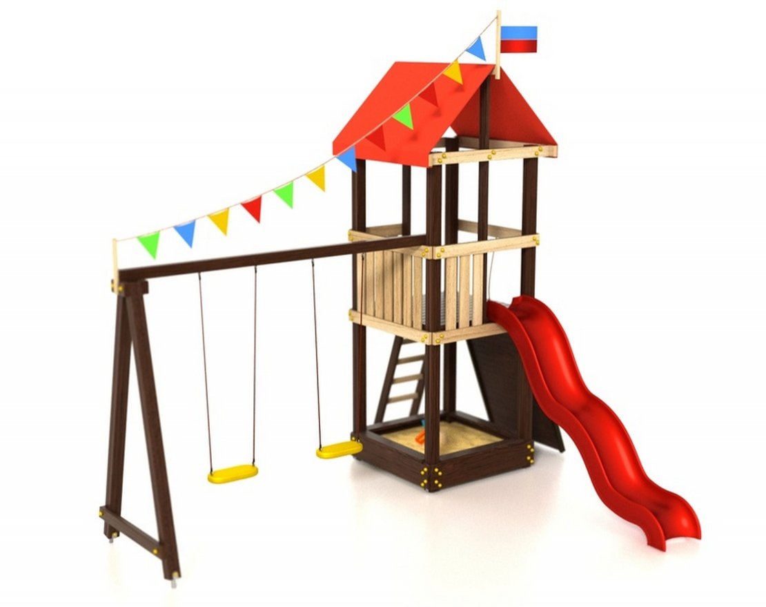 Для максимальной защиты ребёнка от травм, все углы имеют закруглённую форму, крепеж надежно скрыт пластиковыми заглушками. Опоры изготовлены из клееного бруса толщиной 90*90 мм.