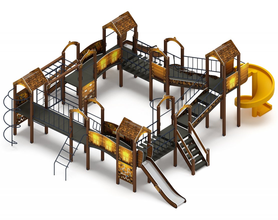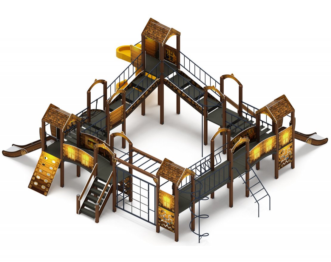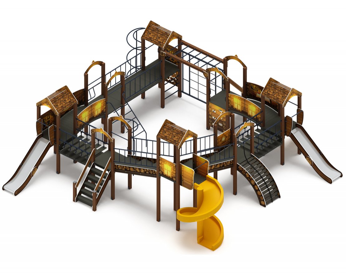 • Особенности комплектации: канат, рукоход, гладиаторская сетка, горка, скалодром, лестница, винтовая горка, спираль, лаз, мост, игровая панель, лаз-дуга, скалолаз