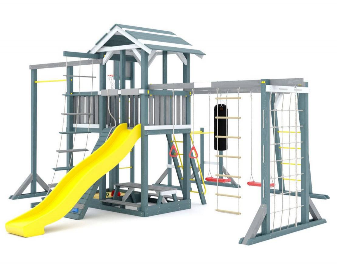 - Детская игровая площадка оснащена настоящим баскетбольным кольцом и подвесной боксёрской грушей.