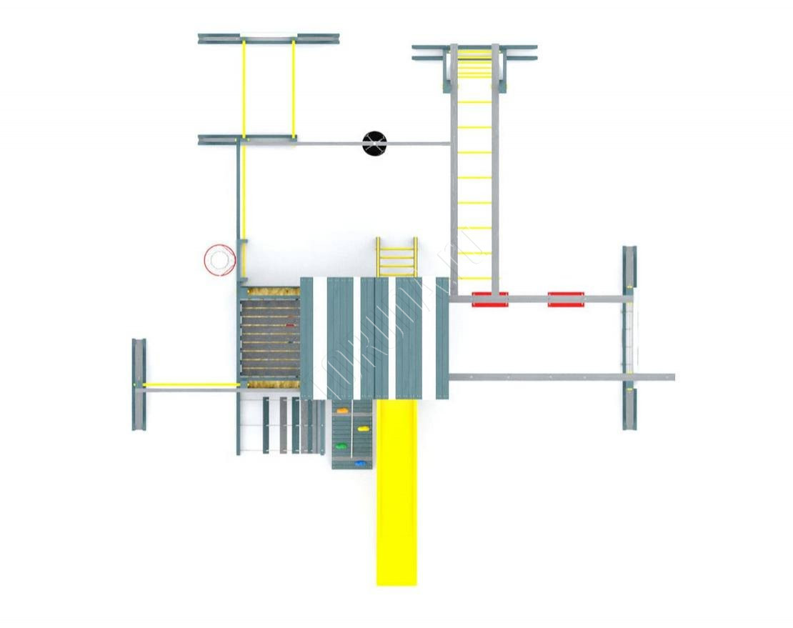 - Для тех, кто любит лазать и забираться на высоту, в модели есть целых четыре спортивных снаряда: шторм-трап (представляет собой более широкий аналог верёвочной лестницы), гладиаторская сетка с большими ячейками, верёвочная лестница (подвешена к балке, не зафиксирована жёстко и может раскачиваться), безопасный канат для лазанья (подвешен на консоли).