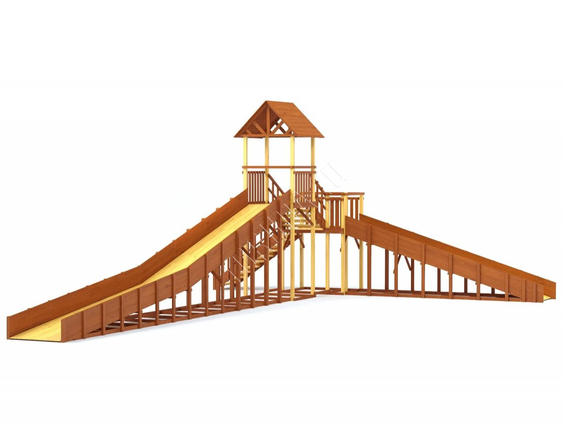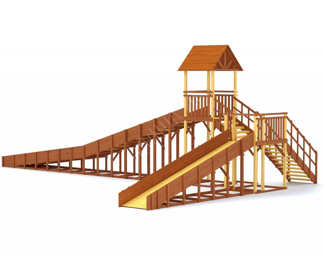 Зимняя горка сделана из качественного клееного бруса – это экологичный, долговечный и прочный материал с красивой древесной фактурой. Конструкция получается устойчивой и удобной, а для большей прочности поверхность покрывается специальным лакокрасочным составом, который повышает стойкость к внешним воздействиям. Покрытие имеет разрешающий сертификат для использования на детских площадках.