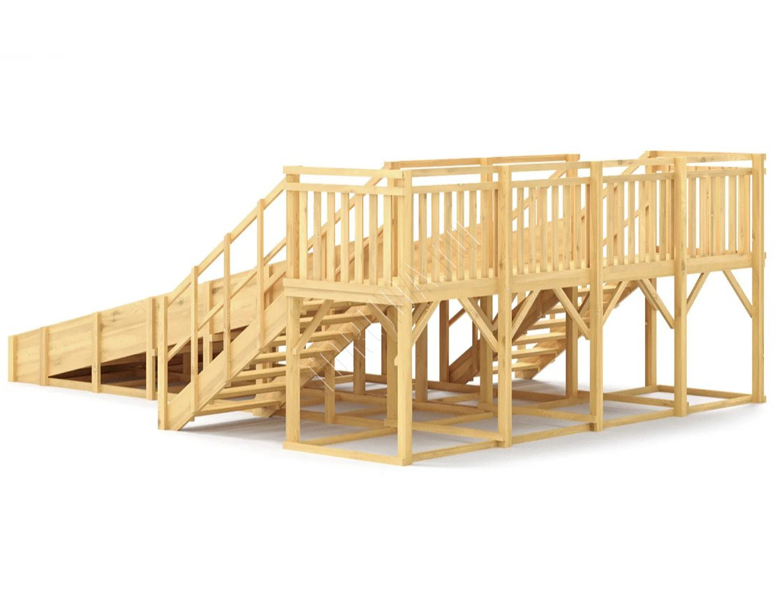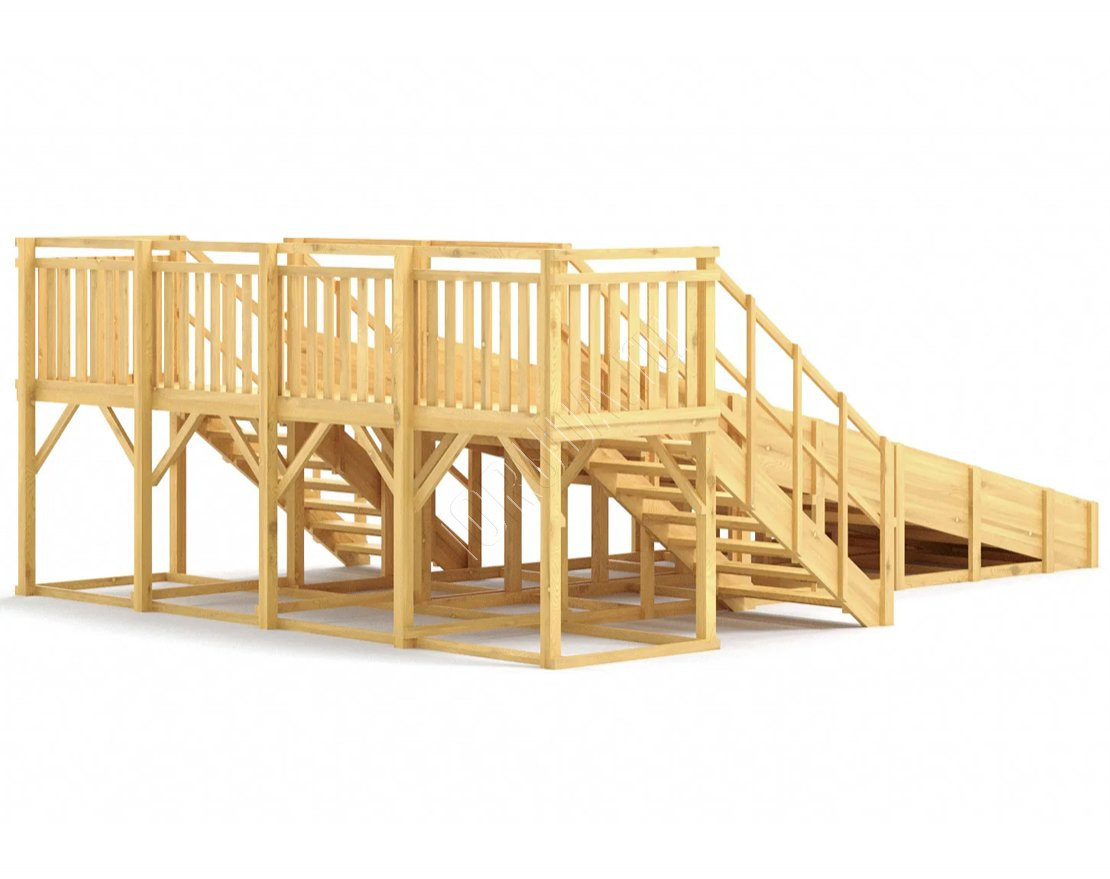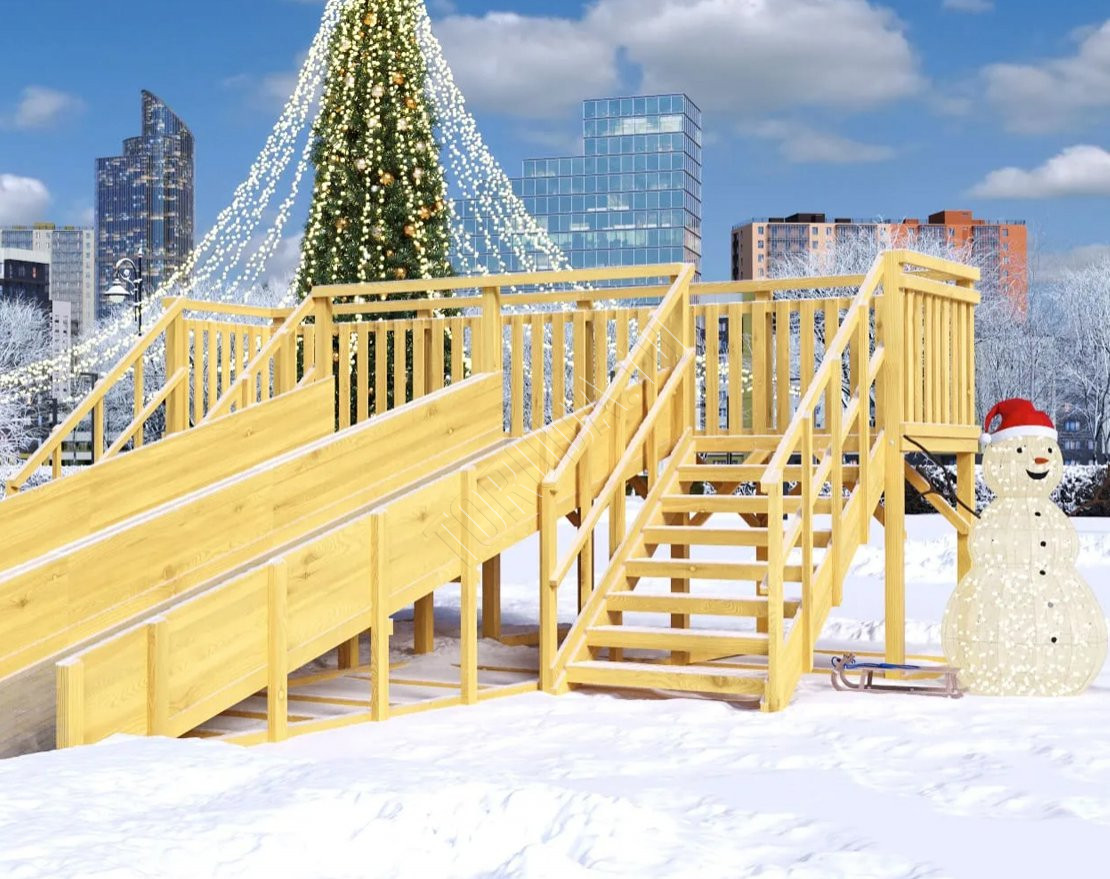 Зимняя горка с двумя длинными скатами по 6 метров, на которых дети смогут кататься без остановки. Конструкция выполнена из прочного клееного бруса