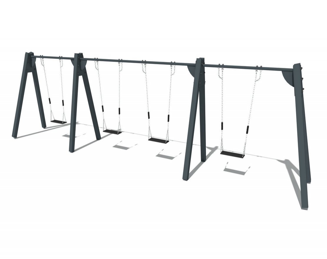 Качели на металлических стойках оснащены 4-мя простыми сидениями без спинок. Изделие предназначено для установки в парках, общественных дворах.