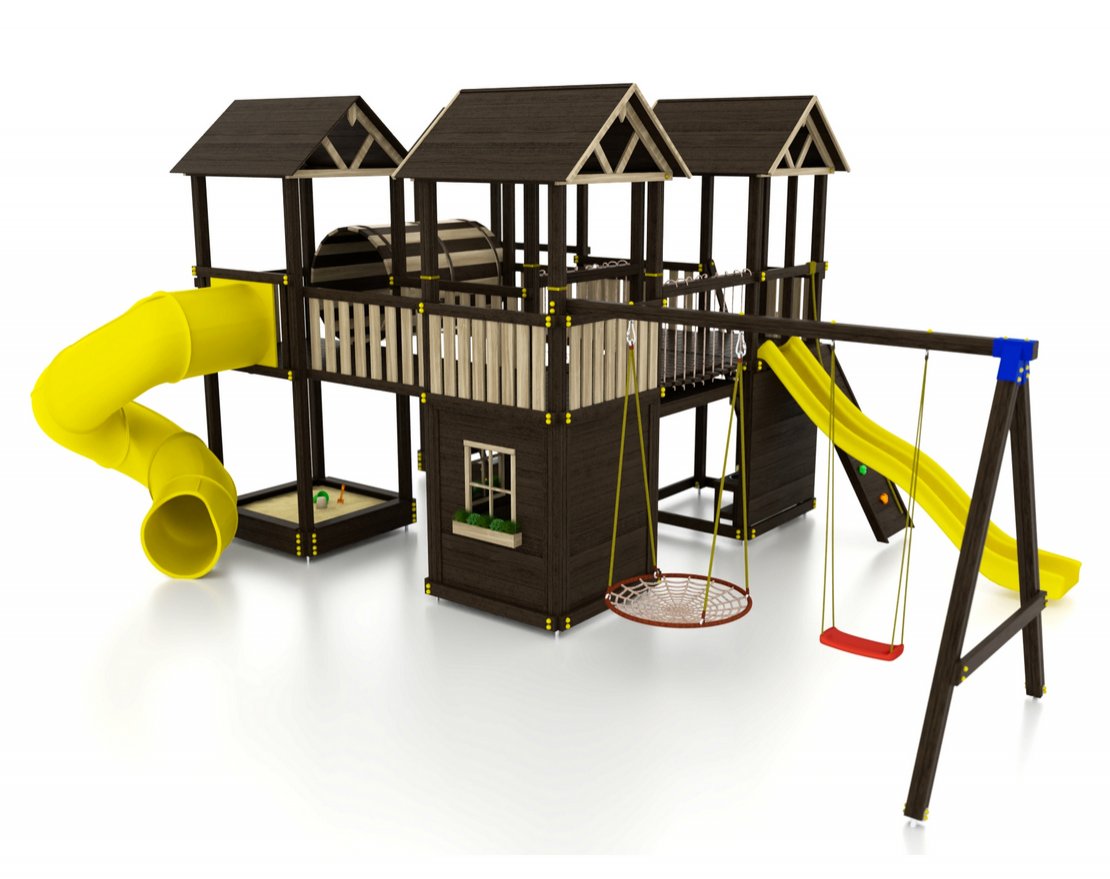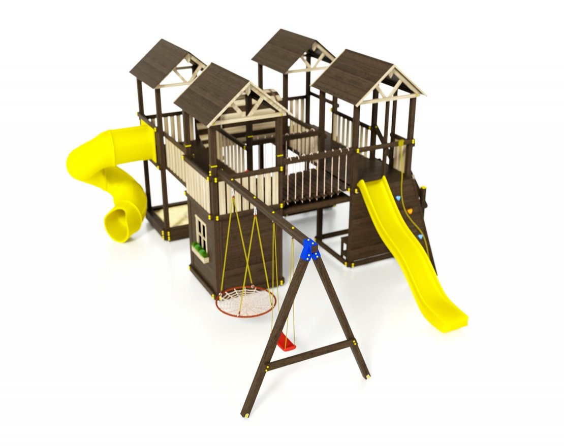 Для максимальной защиты ребёнка от травм, все углы имеют закруглённую форму, крепеж скрыт пластиковыми заглушками. Опоры изготовлены из клеёного бруса толщиной 90*90 мм.