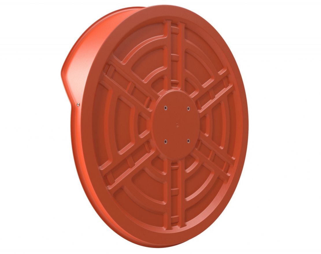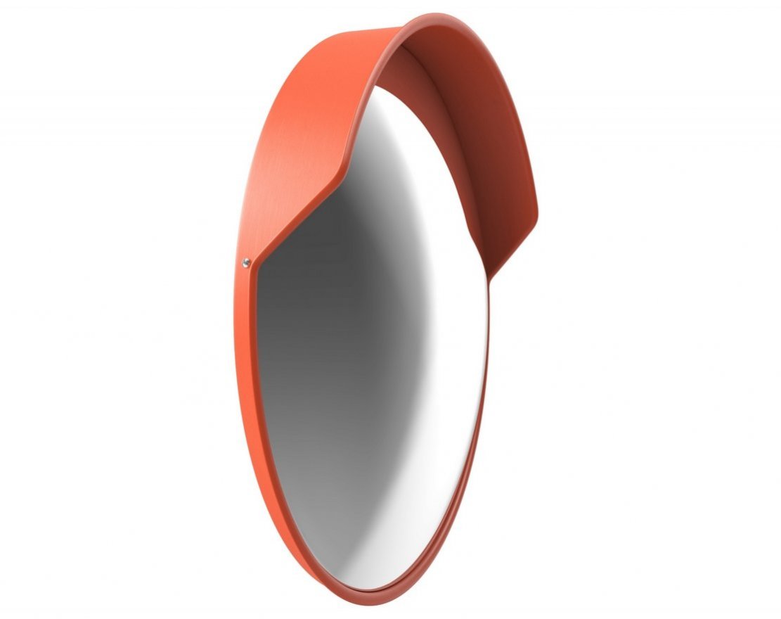 Основа зеркала выполнена из ABS пластика оранжевого цвета. В верхней части предусмотрен козырек для защиты от солнца и осадков. Зеркальная часть выполнена из поликарбоната.