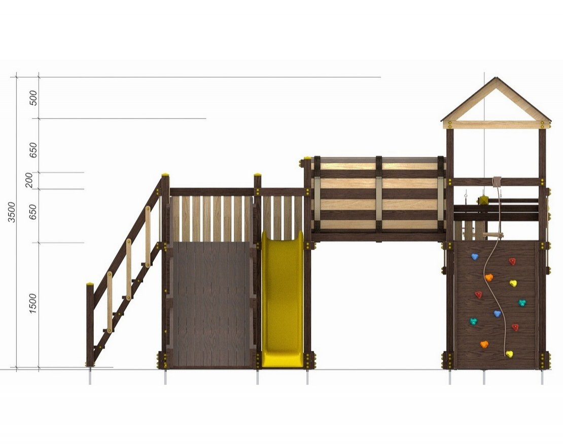 Опоры изготовлены из прочного толстого клееного бруса. Конструкция окрашена безопасной для детей краской на водной основе. Она выполняет сразу две функции. Не выделяет вредных для здоровья ребенка веществ и надежно защищает древесину от деформации и разложения.
