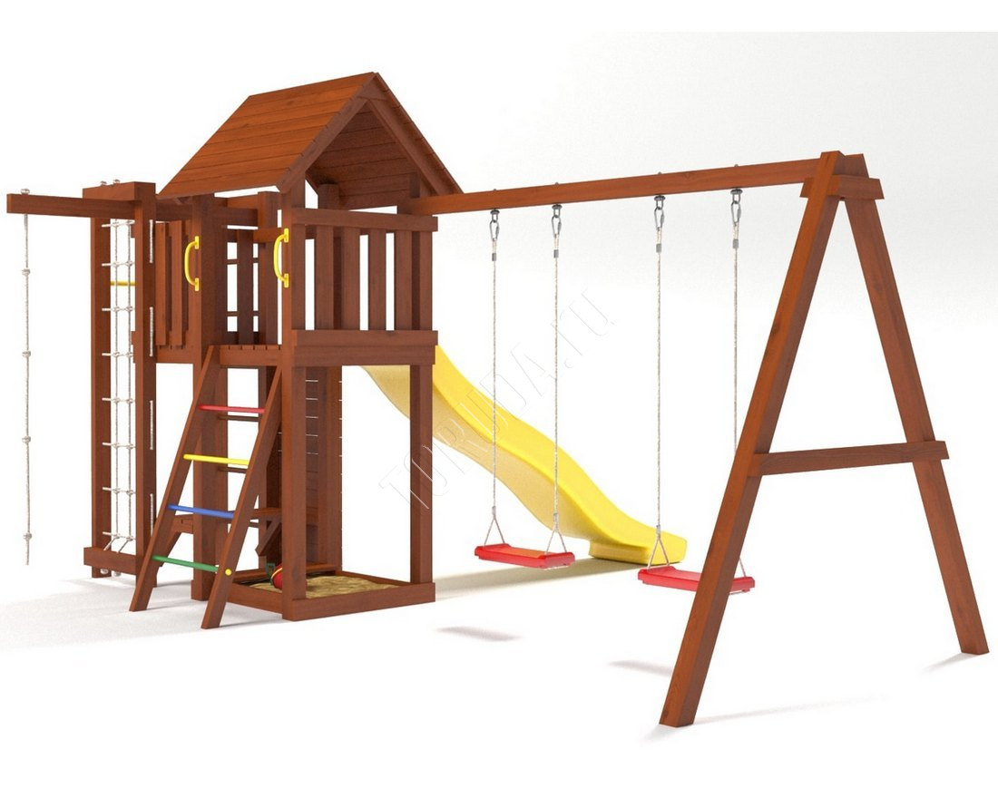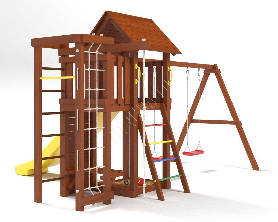 Это универсальное решение для активного досуга и позитивного настроения непосед с трех лет. Комплекс безопасен – конструкция, качество древесины и подвижных элементов соответствуют ГОСТ. Основным материалом является экологичный клееный брус, балки которого отшлифованы и имеют закругленные края.
