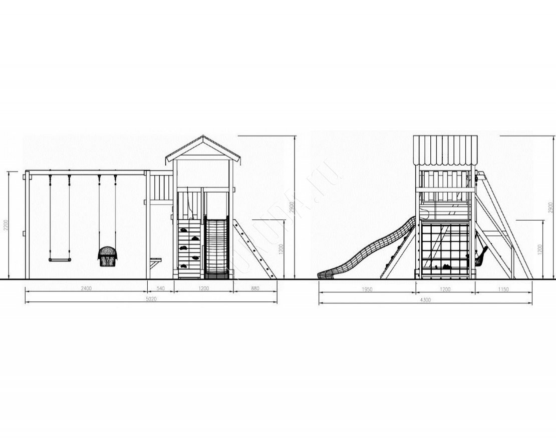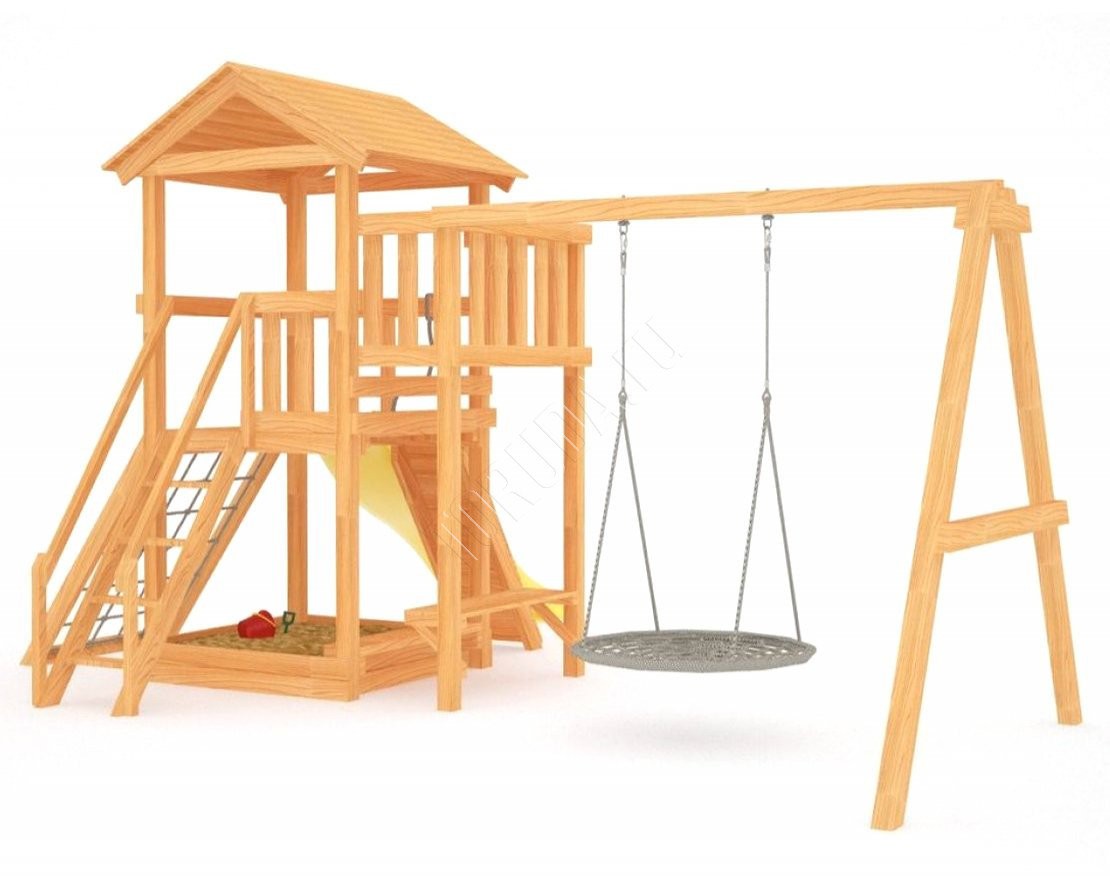 Он безопасен даже для малышей – все крепежи скрыты под заглушками, металлические детали покрыты порошковой краской, а навесное оборудование произведено специально для детей в Бельгии. Основной материал натуральный, балки клееного бруса не выкрашены, края скруглены. Конструкция, качество дерева и подвесные атрибуты соответствуют ГОСТ. Светлая, современная и универсальная площадка удачно расположится в коттеджном посёлке, на территории частного дома или дачного участка.