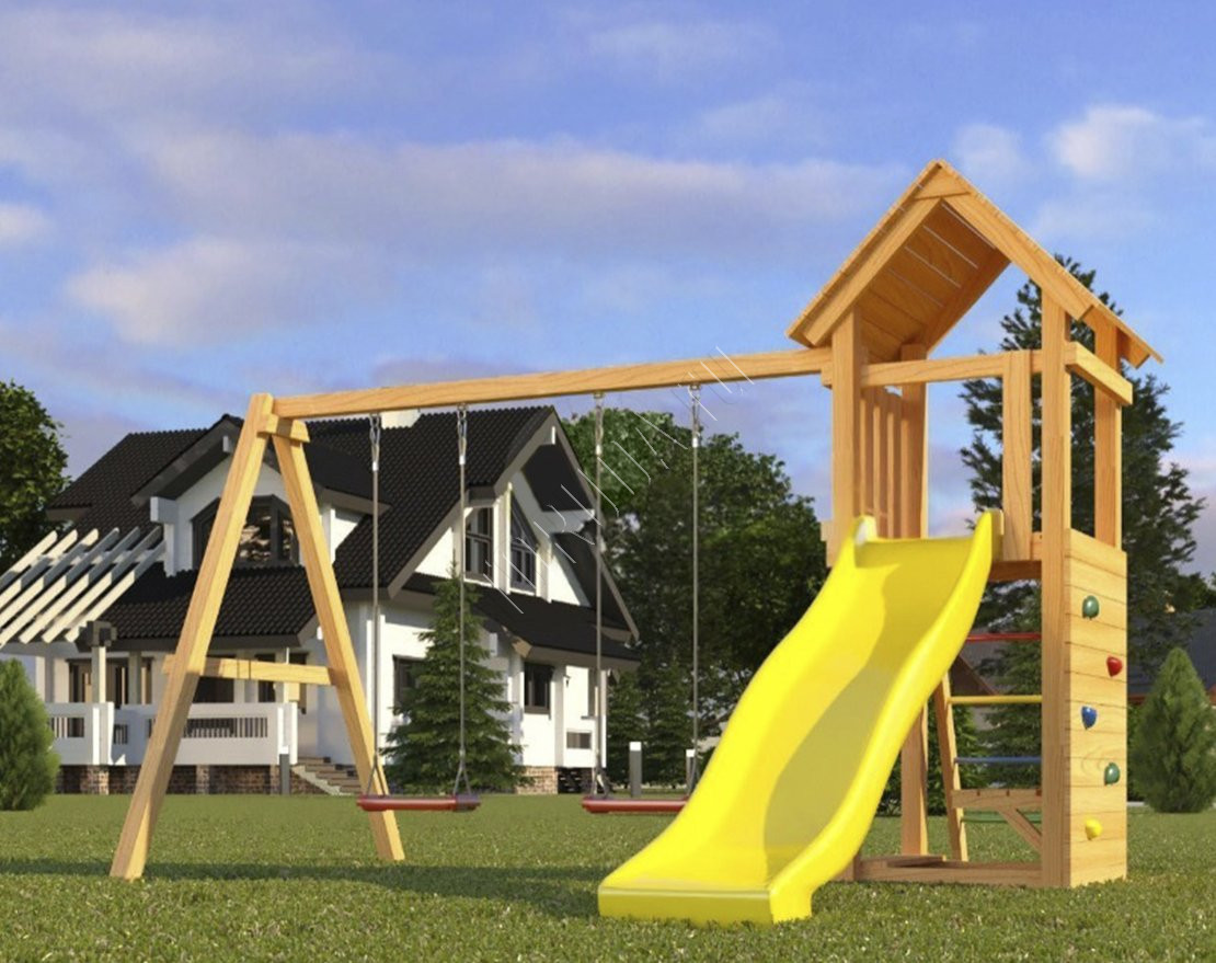 Основной материал натуральный и экологичный – это шлифованный клееный брус, края которого скруглены. Занозы и ссадины исключены. Детская площадка безопасна: конструкция рамы произведена согласно ГОСТ, все крепежи закрыты заглушками, а подвесное снаряжение сертифицировано и создано специально для детей в Бельгии.