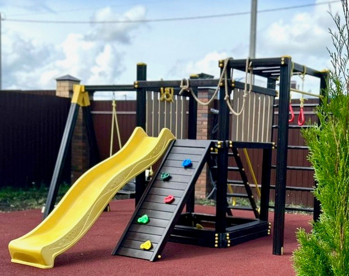 Для максимальной защиты ребёнка от травм, все углы имеют закруглённую форму, крепеж скрыт пластиковыми заглушками. Опоры изготовлены из клеёного бруса толщиной 90*90 мм. Изделие покрыто безопасной для детей высокоустойчивой краской на водной основе, которая надежно защищает древесину от воздействия окружающей среды. Перила, скалодром и лестница производятся по системе "шип паз".