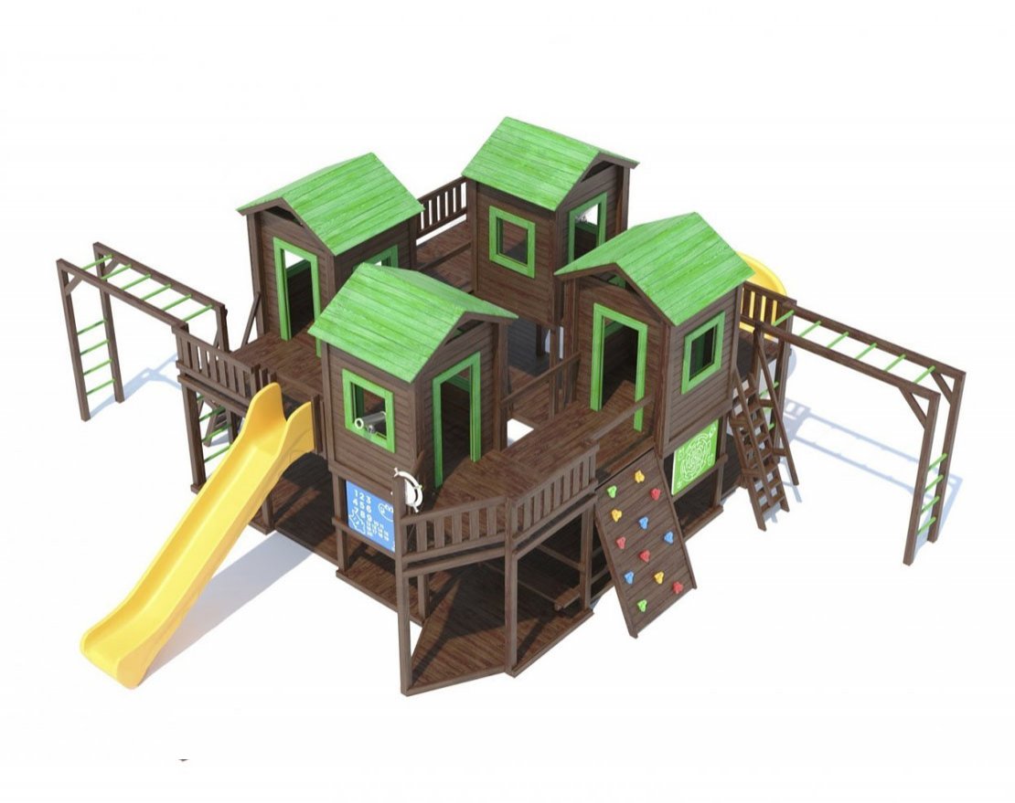 Основа детской игровой - спортивной конструкции – четыре башни с мостами и балконами «серия М». Конструкция оснащена четырьмя двухскатными деревянными крышами, встроенным полом, четырьмя встроенными домиками в верхней части конструкции, двумя встроенными столиками с лавочками в нижней части конструкции, пластиковым антивандальным скатом с превосходной скользящей поверхностью, антивандальным винтовым скатом с переходным мостиком, двумя «П»-образными деревянными рукоходами, двумя скалодромами, двумя канатными лестницами с армированным канатом, двумя деревянными лестницами, антивандальными игровыми панелями, телескопами и штурвалами. Для безопасности ребенка предусмотрены перила на лестнице, заборчики и ограждения над зонами препятствий (скат).