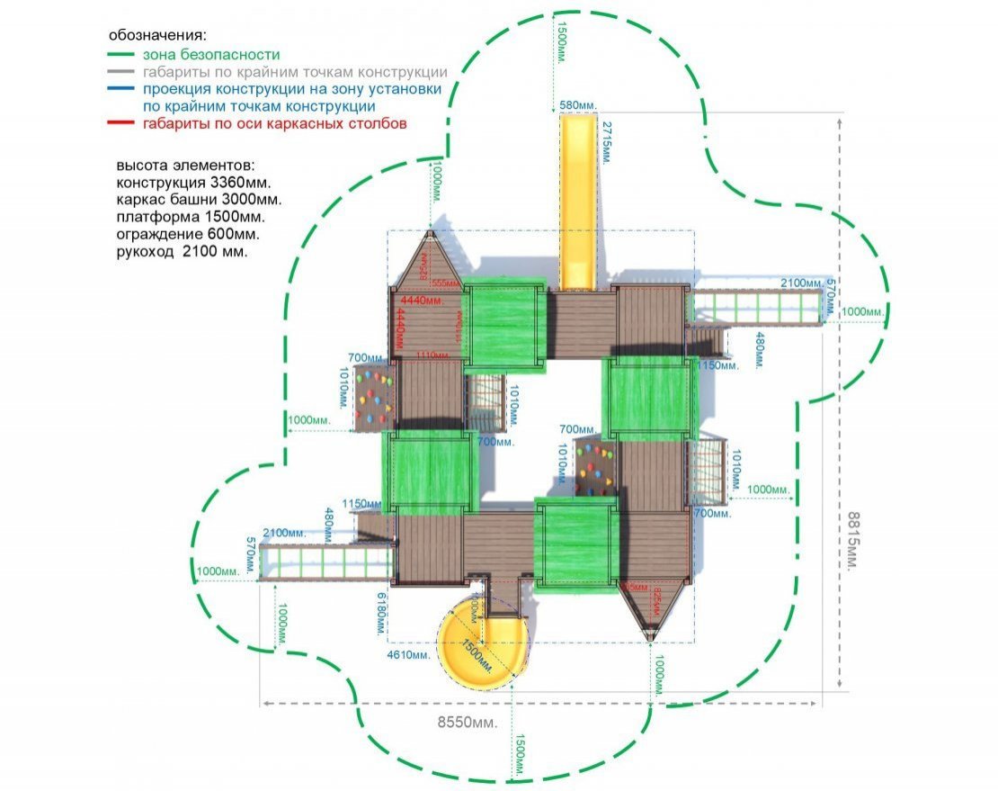 Для безопасной эксплуатации конструкции, площадка должна быть свободна от зеленых насаждений, сооружений и других конструкций, ровная, без перепадов уровня, без впадин и насыпей. Габариты площадки с учетом зоны безопасности длина 11815мм. ширина 11750мм., площадь площадки S-138,8м². Запрещено устанавливать конструкцию в зонах с повышенным риском провалов в грунте (болотистая местность, береговая линия водоемов, в непосредственной близости с оврагами и обрывами).