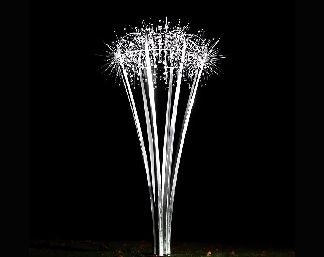 Стальные элементы скульптуры изящно перекликаются между собой, создавая ансамбль, который переливается на свету, отражая солнечные лучи и искрясь в сумерках. Каждый элемент скульптуры предусмотрен таким образом, чтобы реагировать на порывы ветра, напоминая бурлящие воды и создавая эффект плавности и легкости.