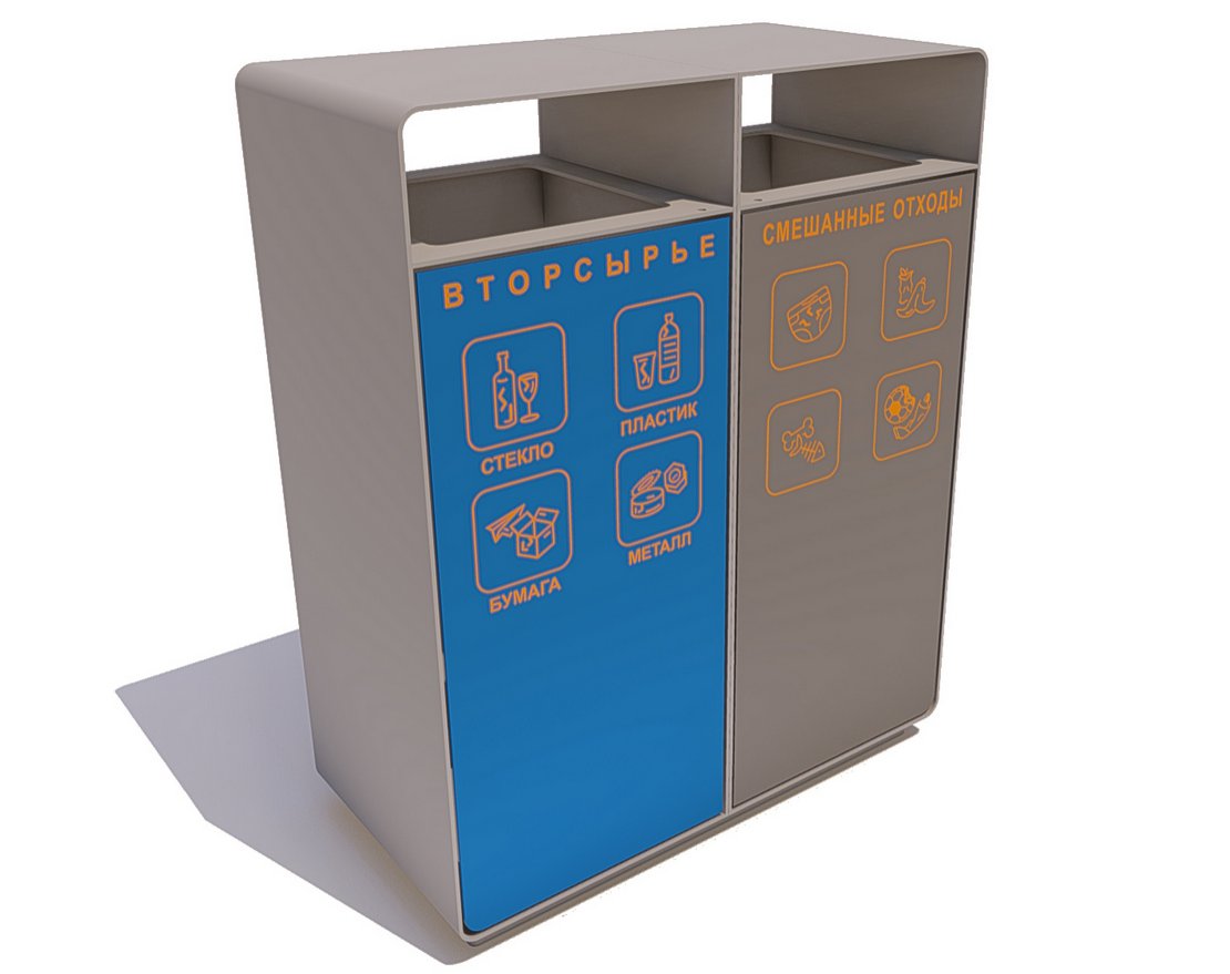 Урна «Город для раздельного сбора мусора» – двухсекционная конструкция. Внутри стоят 2 оцинкованных бака ёмкостью 70 л. В один складывают отходы, предназначенные для последующей переработки, в другой — смешанный мусор.